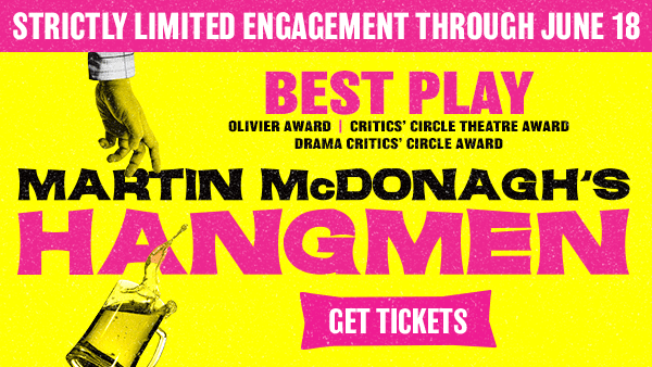 “The best new play on Broadway” is Martin McDonagh’s HANGMEN, raves The New York Post. From the Academy Award–winning writer of Three Billboards and In Bruges, HANGMEN is a New York Times Critics Pick, “a rollicking comedy, and a rip-roaringly hilarious whirlwind.” The Washington Post calls HANGMEN “a bona fide humdinger of a black comedy” and it’s already the winner of three Best Play awards. Don’t miss Martin McDonagh’s HANGMEN on Broadway, now through June 18th only. Get tickets at HangmenBroadway.com
